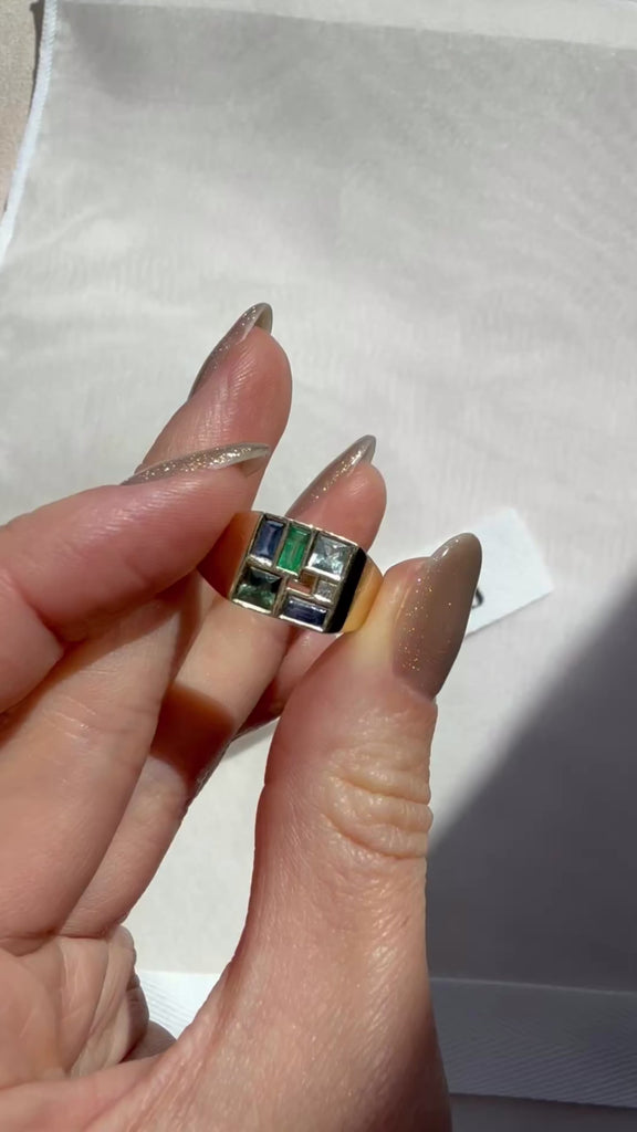 Crafted in recycled 14k yellow solid gold, the ring features natural blue sapphire, emerald, green spinel, and white diamond arranged in the signature Poetic Mind grid — a structured, artistic layout with subtle depth and luminosity.